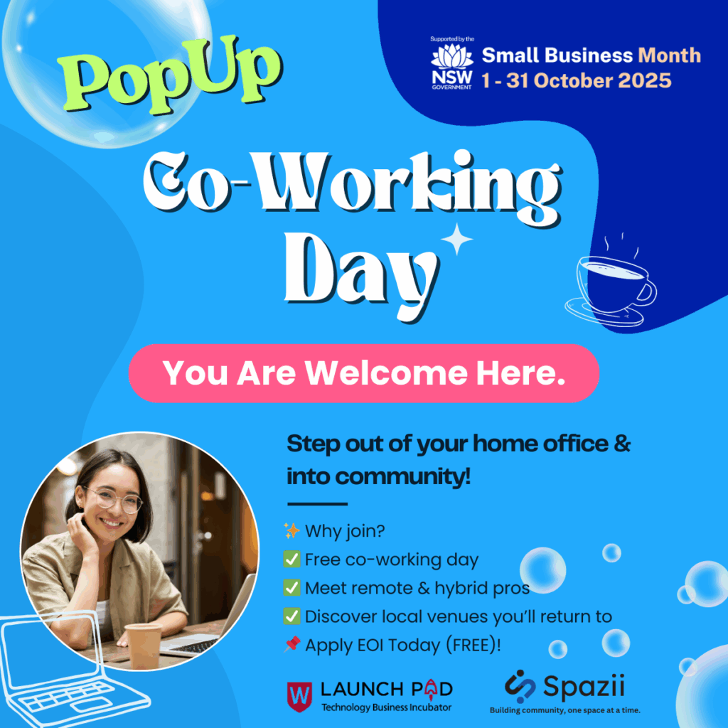 Working from home or bouncing between meetings can be isolating. This October, as part of NSW Small Business Month 2025, Spazii in collaboration with Launch Pad, Western Sydney University is bringing you: